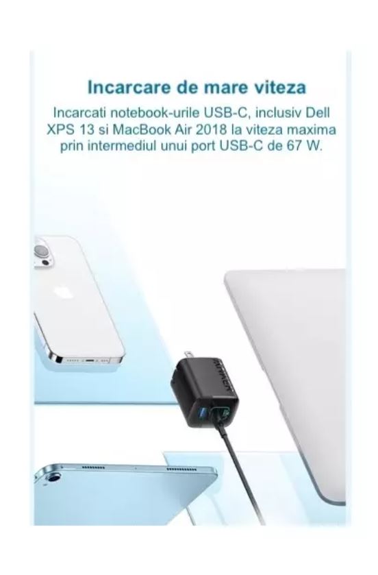 Un port USB C echipat cu tehnologia PowerIQ 3.0 ofera o putere maxima de 67 W, in timp ce USB-A suporta 22,5 W.