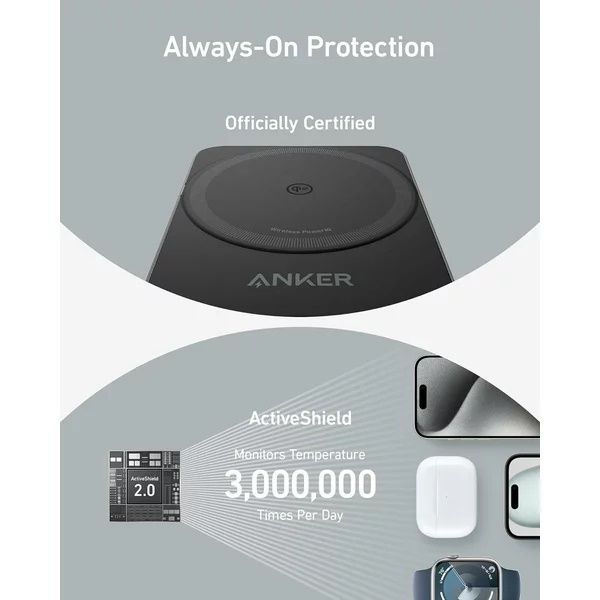 Incarcator wireless magnetic Anker MagGo 3-in-1, MagSafe compatibil, 15W, Qi2 Certificat, Pliabil, (incarcator si cablu USB-C inclus) Negru
