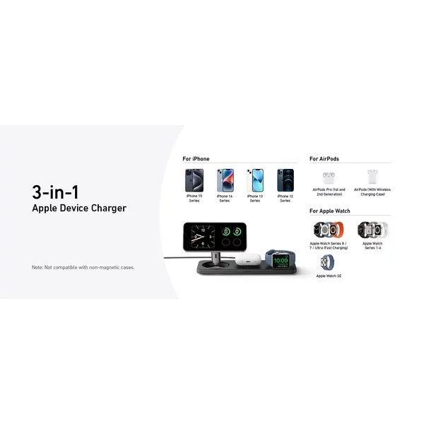 Alimentati-va fara probleme iPhone-ul, AirPod-urile si Apple Watch-ul simultan cu acest stand de incarcare 3-in-1. (Nota: pentru o incarcare optima, utilizati incarcatorul de perete USB-C PD de 40 W furnizat.)