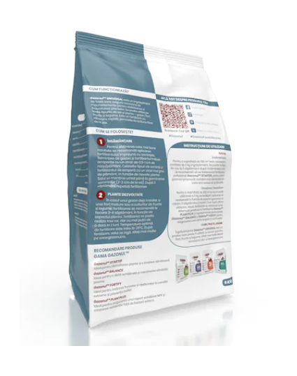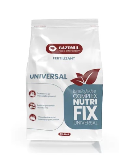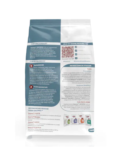 Gazonul™ UNIVERSAL este un ingrasamant de baza care asigura necesarul de macroelemente pentru stabilizarea si dezvoltarea plantelor. Se recomanda sa se utilizeze pe toate tipurile de sol si plante – gazon,flori, fructe si legume. Este un fertilizant cu eliberare rapida, perioada de actiune fiind de 14 zile.