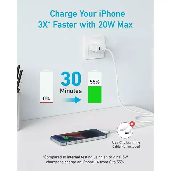 Experimenteaza puterea vitezelor de incarcare de 3X mai rapide si incarca-ti iPhone 14 de la 0 la 50% in doar 30 de minute.