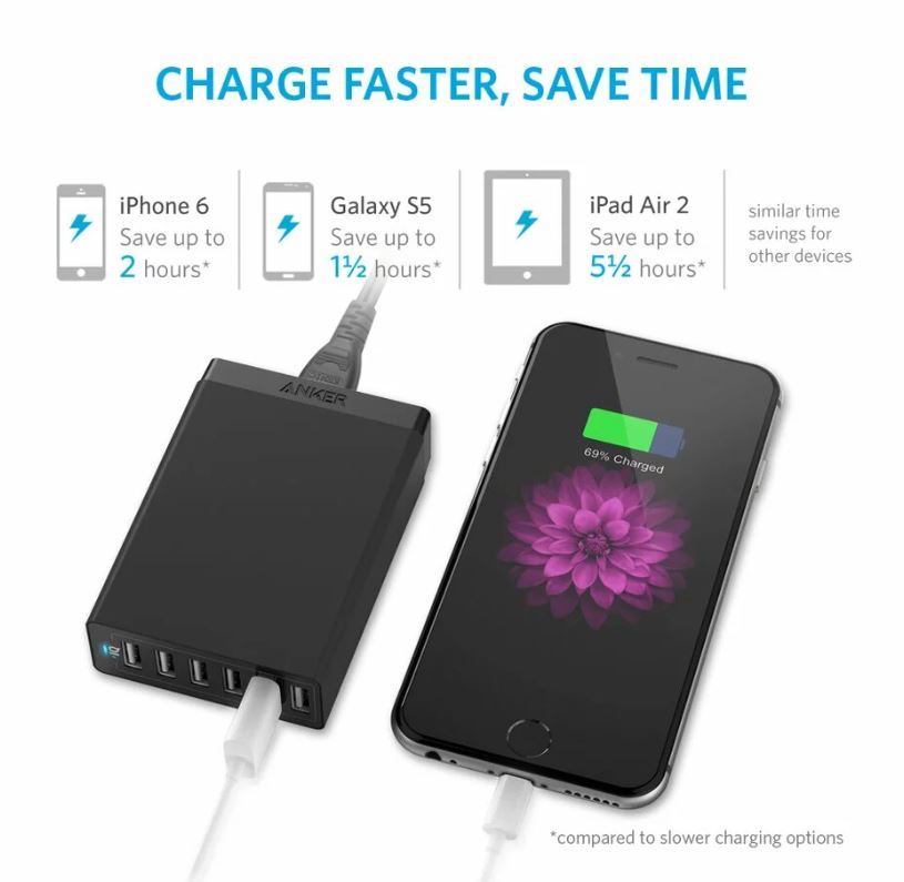 - Anker PowerPort 6 (Incarcator 60 wati cu 6 porturi USB)