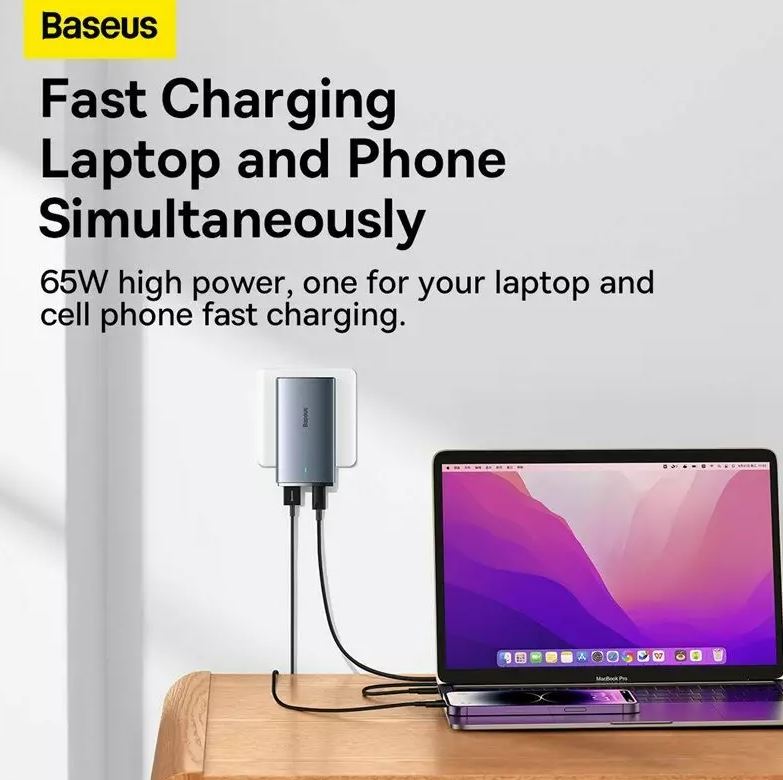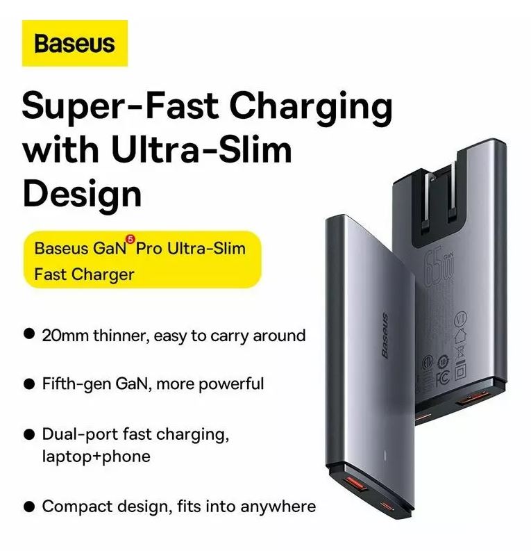 Incarcator retea Baseus GaN5 Pro Ultra Slim, 65W, USB, USB-C, Cablu inclus