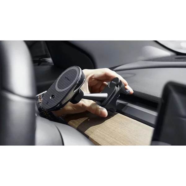 Suportul auto Pitaka MagEZ Car Mount Pro 2 (Tesla) cu MagSafe ofera o viteza de incarcare rapida de pana la 15 W pentru telefonul dvs. Incarcatorul este echipat cu senzori care detecteaza cresterea temperaturii, tensiunii si curentului pentru a va proteja eficient dispozitivele in timpul utilizarii in vehicul. Pitaka MagEZ Car Mount Pro 2 Car Vent Black (Tesla) ofera o incarcare wireless eficienta de pana la 15 W. Ventilatorul sau unic incorporat nu numai ca mentine racoare in timp ce previne supraincalzirea, dar si protejeaza suportul pentru masina MagEZ Pro si smartphone-ul in timpul incarcarii wireless. In plus, incarcatorul este echipat cu senzori care detecteaza cresterea temperaturii, tensiunii si curentului pentru a va proteja eficient dispozitivele in timpul utilizarii in vehicul. O conexiune sigura Cu magnetii MagSafe premium incorporati, care asigura o potrivire stabila si o incarcare wireless fiabila a telefonului dvs. compatibil MagSafe, chiar si pe drumuri accidentate. In plus, suportul auto Pitaka MagEZ este potrivit pentru Tesla si alte marci de masini datorita bilei pivotante universale cu diametrul de 17 mm, care asigura o compatibilitate larga cu diferite modele de masini. Aceasta minge poate fi detasata cu usurinta pentru a instala suportul pe o bicicleta sau motocicleta. Suportul pentru masina Pitaka este conceput pentru confortul utilizatorului, inclusiv cipuri NFC incorporate care va permit sa lansati programe preconfigurate prin simpla atingere a telefonului cu NFC de suportul pentru masina. Trei comutatoare NFC va permit sa comutati convenabil functionalitatea. Designul minimalist al monturii combina un profil simplificat cu stratul de vid pentru PC si fibra aramida pentru a oferi suportului dvs. auto MagSafe un aspect sofisticat si un atractiv.Specificatii