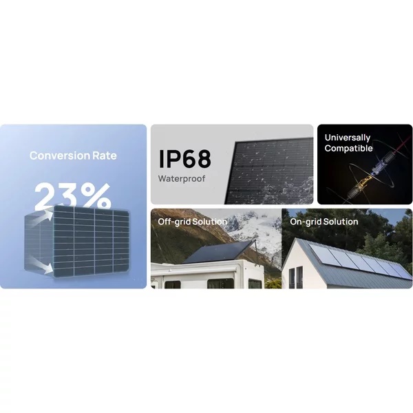 Construit pentru a rezista la vreme extrema si a rezista decenii intregi. Proiectat pentru a rezista la vant extrem de pana la 2400 Pa si la zapada de pana la 5400 Pa. Panoul solar EcoFlow Rigid cu clasificare IP68 este versatil datorita capacitatii sale de a rezista la murdarie, praf si jeturi de apa de joasa presiune.