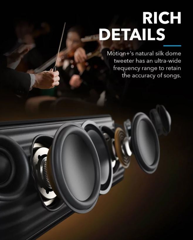 Tweeterele duble de 40 kHz cu frecventa ultra inalta, wooferele din neodim si radiatoarele pasive ale Motion+ produc 30 W de sunet bogat.