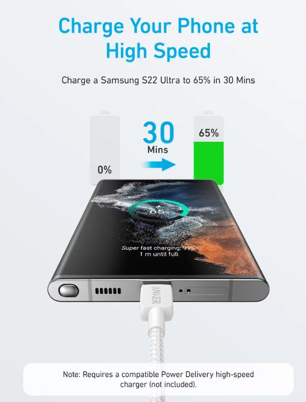 Compatibil cu fast charging:incarcati un Samsung S22 Ultra la 65% in doar 30 de minute atunci cand folositi Power Delivery.