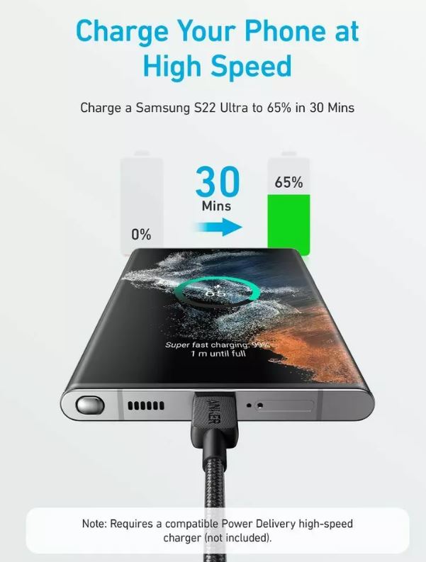 Compatibil cu fast charging:incarcati un Samsung S22 Ultra la 65% in doar 30 de minute atunci cand folositi Power Delivery.