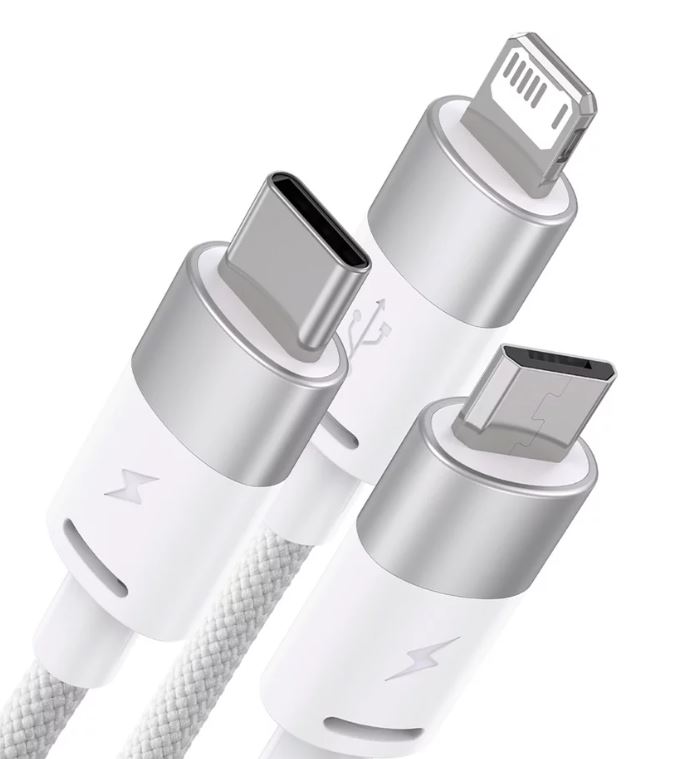 Cablu USB - Lightning / Micro / Type-C cu o lungime maxima de 1,20 m. Acceptaincarcarea cu un curent total de 3,5 A(2 A cand este conectat un dispozitiv) sitransmisie de date de 480 Mbs (doar pe conectorul Lightning).