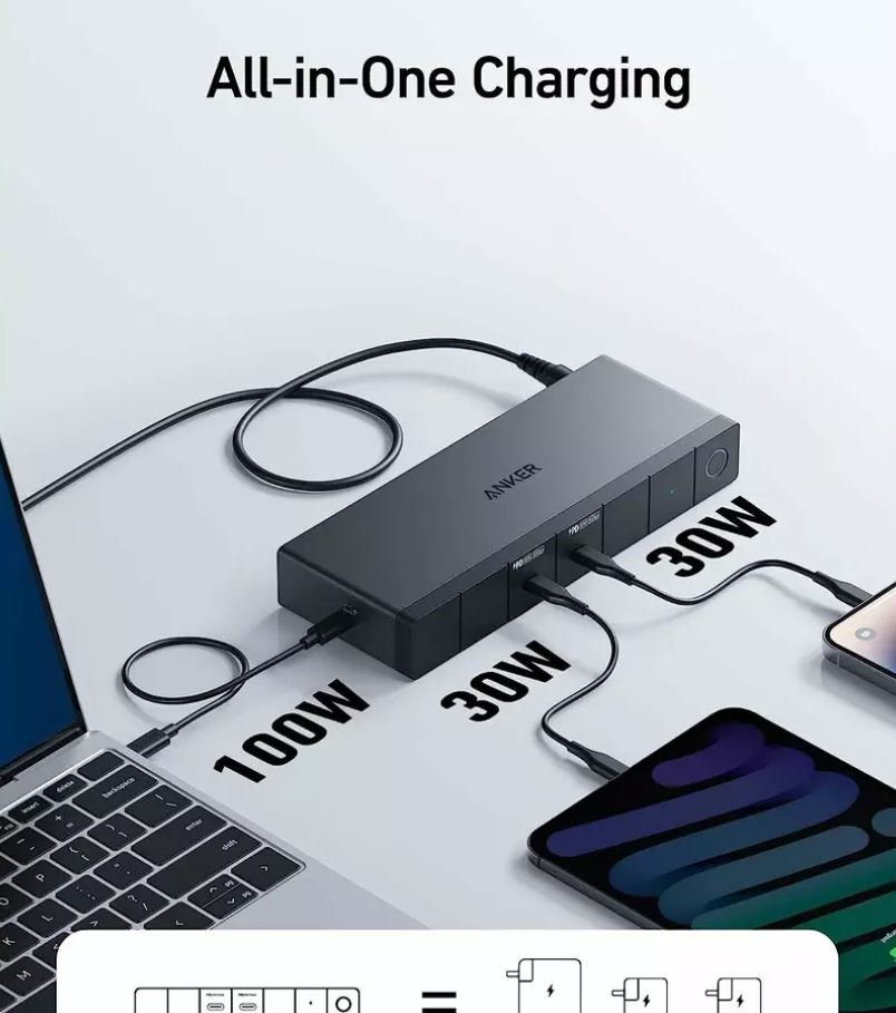 Pastrati-va laptopul alimentat cu incarcare maxima de 100 W prin intermediul portului USB-C upstream si incarcati-va celelalte dispozitive la o putere de pana la 30 W prin intermediul celor 2 porturi USB-C.