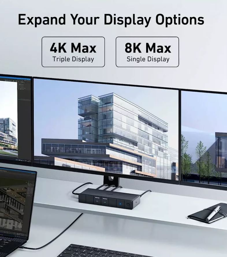 Cu o latime de banda upstream 40 Gbps, puteti sa afisati simultan continut media pe un singur monitor in 8K si sa transferati fisiere la o viteza de pana la 10 Gbps. Echipat cu un port upstream USB4 de 100 W max. 100W, 2 porturi USB-C (10 Gbps, 30W), 4 porturi USB-A, un port Ethernet, un port HDMI 2.0 si 2 porturi Display.