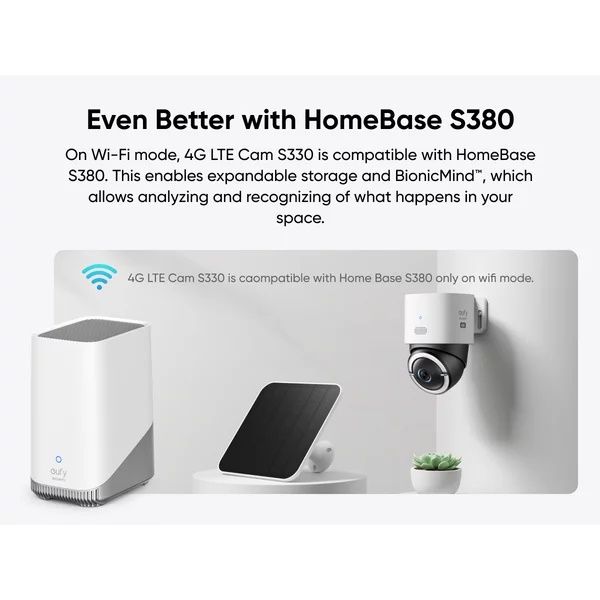 In modul Wi-Fi, 4G LTE Cam S330 este compatibil cu HomeBase S380. Acest lucru permite stocarea extensibila si BionicMind™, care permite analiza si recunoasterea a ceea ce se intampla in dvs spatiu.