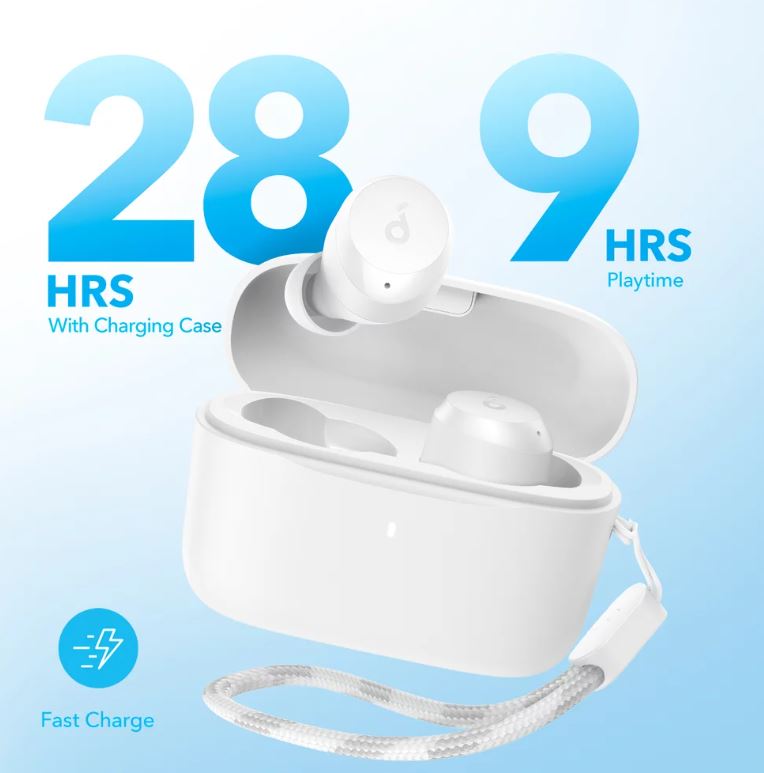 Castile True Wireless Soundcore A25i au o autonomie de 9 ore cu o singura incarcare si 28 de ore cu carcasa de incarcare, perfecte pentru ascultarea in miscare.
