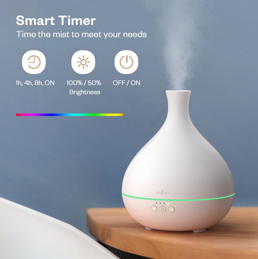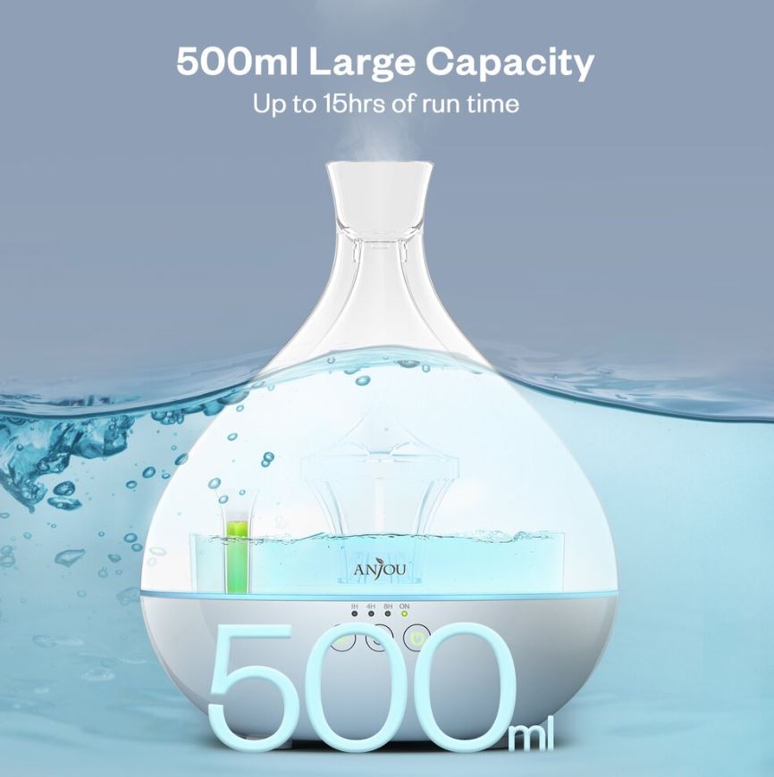 Difuzorul de aroma Anjou AJ-AD012 are capacitate imensa de 500 ml pentru 8 ore de utilizare continua. Se poate folosi si in mod temporizator: 1h, 4h, 8h.