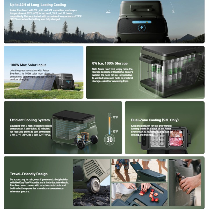 Anker EverFrost Cooler are o autonomie de 36 de ore si poate fi alimentat de la un panou solar pentru autonomie nelimitata.