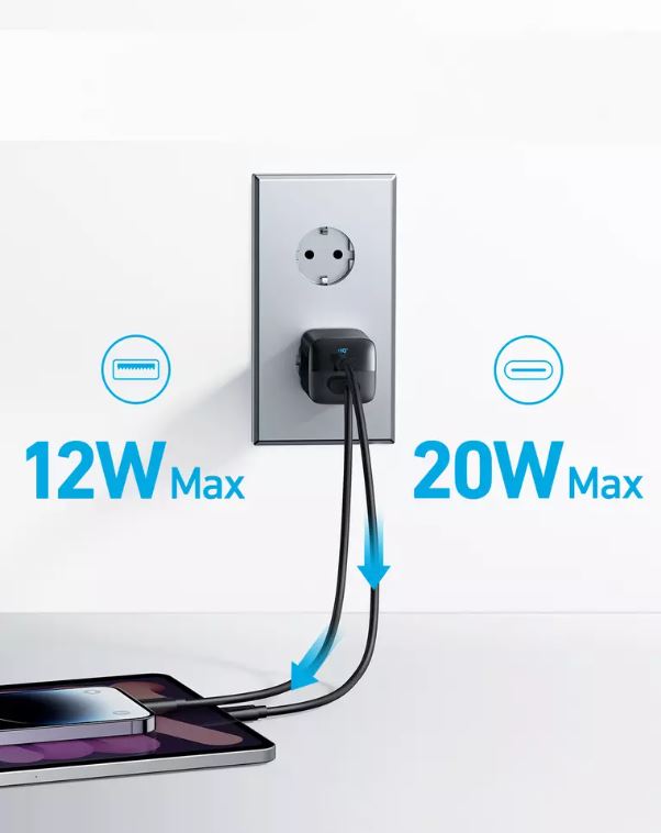 Conecteaza un dispozitiv la portul USB-C pentru a obtine o incarcare de 20W si conecteaza un alt dispozitiv la portul USB-A pentru a incarca cu pana la 12W.