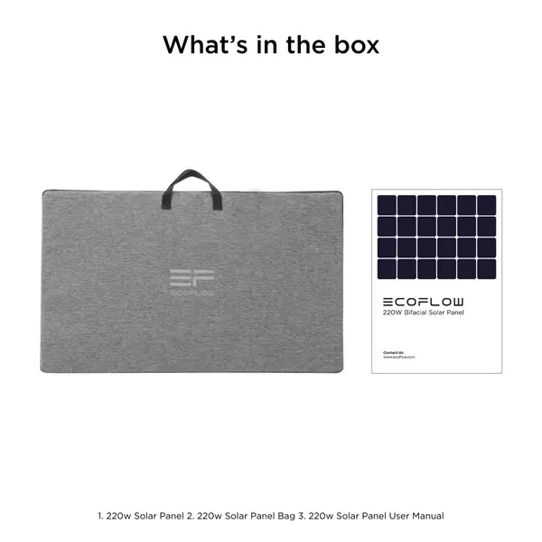 1x panou solar 220W EcoFlow, 1x geanta panou solar, 1x manual utilizare