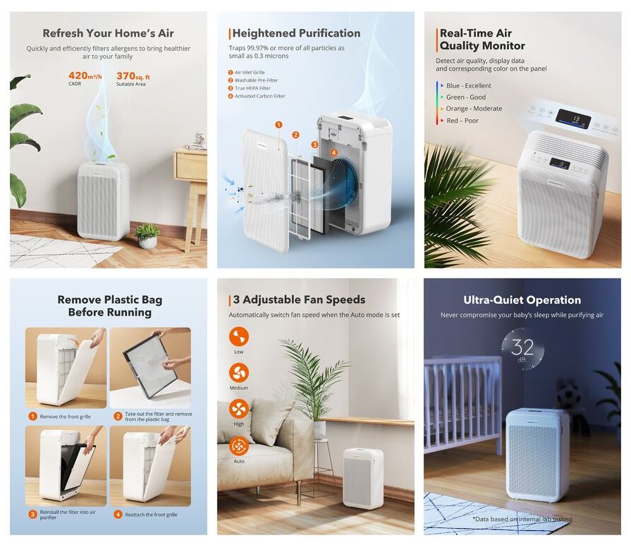 Purificatorul de aer TaoTronics model TT-AP003 va protejeaza copiii impotriva parului animalelor de casa si a parului, permite tuturor membrilor familiilor dvs. sa respire aer pur si sa traiasca intr-un mediu cat mai sanatos.