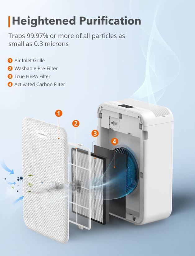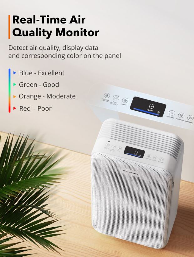 Purificatorul de aer TaoTronics, model TT-AP003, filtreaza rapid si eficient polenul, parul de animale de companie si praful din aer intr-o suprafata de 30 mp. Are in componenta un pre-filtru, un filtru de carbune activ si filtru HEPA care elimina in mod eficient 99. 97% din particulele aeriene de pana la 0,3 microni. Filtrarea puternica in 3 etape capteaza si elimina agentii patogeni din aer pentru a oferi cel mai curat aer. Senzorul incorporat detecteaza in timp real calitatea aerului din incapere si va afisa cu exactitate prin culori gradul de poluare. Purificatorul de aer va indica cand filtrul trebuie inlocuit.