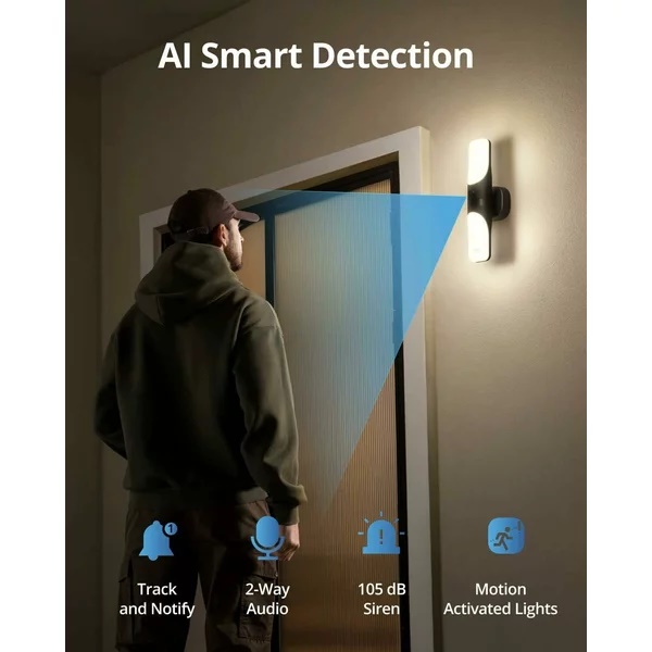 Vizualizati fluxul live si filmarile cu Night Vision color 2K HD, astfel incat sa nu pierdeti niciun detaliu. eufy Wired Wall Light Cam are un senzor mare pentru camera, astfel incat sa puteti vedea o imagine completa a vizitatorilor din cap pana in picioare, sa va vedeti masina parcata pe alee si sa verificati livrarile la usa.
