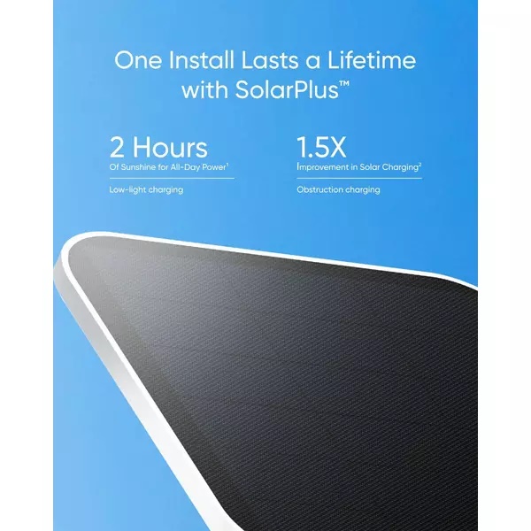Tehnologia SolarPlus™ de la eufy reduce semnificativ necesarul de lumina pentru incarcare, functioneaza eficient chiar si atunci cand este obstructionata chiar si cu 50%, și optimizeaza aportul de energie in timp real. Este compatibila cu HomeBase 3.
