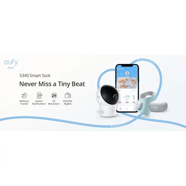 Set monitorizare bebe eufy Smart Sock Baby Monitor S340, Camera 2K, 2.4 GHz Wi-Fi, Pan & Tilt, urmarire ritm cardiac si niveluri de oxigen din sange, detectie AI Cry, Alb