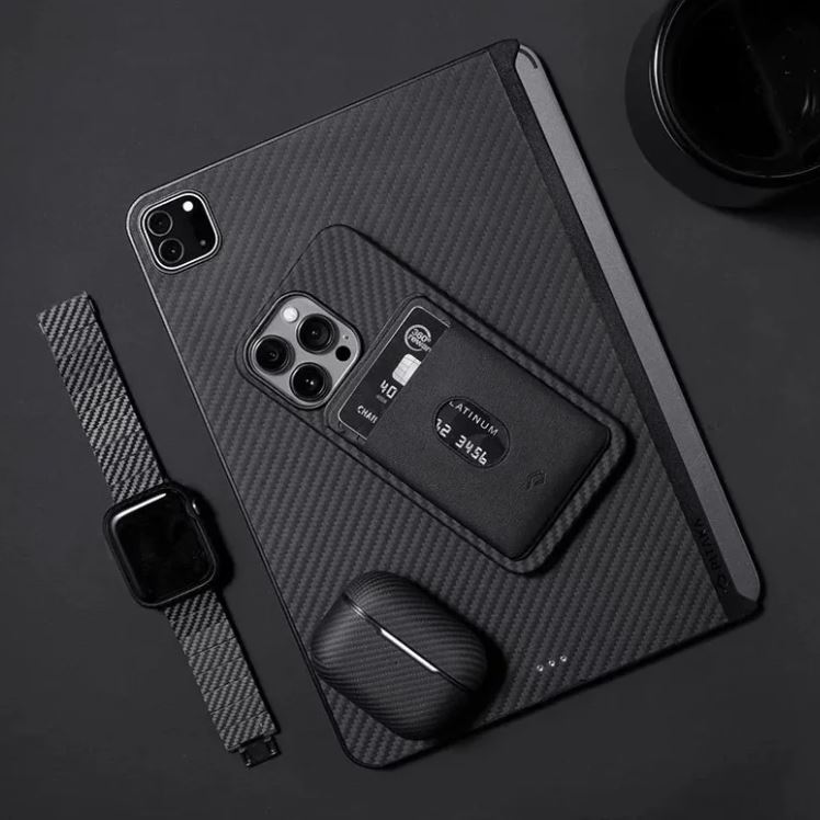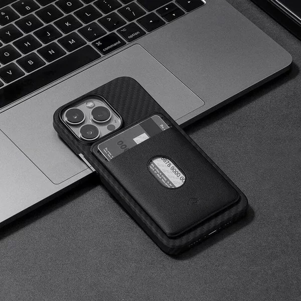 Suportul Pitaka MagSafe are un design slim permite utilizarea confortabila a telefonului chiar si cu portofelul atasat.