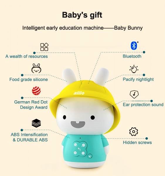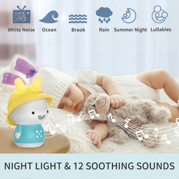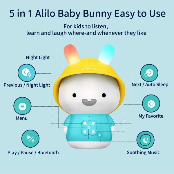 Boxa interactiva Bluetooth pentru copii cu continut in limbile romana si engleza Baby Bunny Alilo este un prieten de incredere pentru cei mici. Caciula iepurasului este facuta dintr-un silicon special care poate fi indepartat si muscat. Semnele de pe butoane sunt foarte intuitive si usor de apasat pentru a le fi celor mici usor sa treaca de la o melodie la alta sau de la o poveste la alta. O lumina de noapte cu lumina relaxanta se asigura ca micutului tau nu ii va fi frica sa adoarma in intuneric. Cu o incarcare completa a bateriei iepurasul va continua sa functioneze timp de peste 6 ore Baby Bunny Alilo are o conexiune Bluetooth magica ce permite conectarea acestuia la o multime de dispozitive electronice. Poti alege cantecul de leagan preferat al bebelusului tau si iepurasul il va reda. Alilo Baby Bunny reda peste 100 de povesti clasice si cantece in limbile romana si engleza muzica linistitoare si sunete de fundal pentru a ajuta copiii sa creeze ritualuri si rutine de somn. Cel mai nou membru al familiei Un player digital lampa de veghe si povestitor pentru bebelusi si copii de toate varstele Culorile actuale in nuante pastelate baby blue si powder pink se potrivesc esteticii mamelor tinere iar palaria poate fi indepartata pentru a stimula abilitatile motorii ale bebelusului. Specificatii tehnice Autonomie baterie 6 ore Silicon sigur pentru copii Card memorie 8 GB Cardul de memorie vine gata incarcat cu 24 de cantece in limba romana 16 povesti in limba romana 48 cantece in limba engleza 12 piese instrumentale 16 povesti in limba engleza Incarcare prin cablu tip USB-C UTILIZARE FACILA SI INTUITIVA PRIN ATINGEREA UNUI BUTON Ajuta dezvoltarea cognitiva LITERE FORME CIFRE CULORI. CONTINUT RO 24 cantece Arici Pogonici Ceata lui Pitigoi Daca vesel se traieste In padurea cu alune Gainusa cea motata Iepuras coconas Melc melc codobelc Pupaza din tei Ratustele Un elefant se legana Noi suntem pitici Daca vesel se traieste O furnica duce in spate Taranul e pe camp Alunelu O ratusca sta pe lac Podul de piatra s-a daramat Vine vine primavara De ziua ta mamico Are mama o fetita Saniuta fuge Alfabetul muzical Cucule pasare sura Bate vantul frunzele 16 povesti Printesa si bobul de mazare Hainele cele noi ale imparatului Cenusareasa Frumoasa adormita Ratusca cea urata Sarea in bucate Praslea cel voinic si merele de aur Punguta cu doi bani Ursul pacalit de vulpe Alba ca Zapada Scufita Rosie Aleodor Imparat Mica Sirena Tinerete fara batranete si viata fara de moarte etc