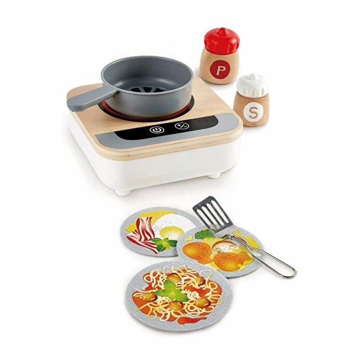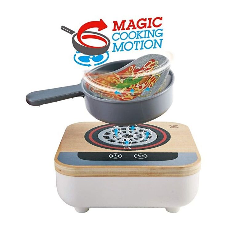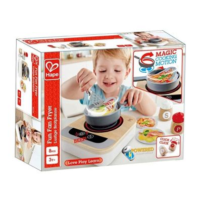 Invata sa gatesti cu acest aragaz. Are un ventilator incorporat. Fara caldura! Include sase retete pe trei discuri de pasla, o spatula metalica si un set de recipiente cu sare si piper. Pregatiti mesele pentru prietenii si familia dvs. ca un adevarat bucatar! Alegeti o reteta, porniti aragazul si amestecati mancarea. Aragazul se va opri automat daca nu este utilizat timp de 90 de secunde.� Ventilatorul din aragaz face ca alimentele sa se miste realist in tigaie. Comutatorul senzorului va permite sa comutati intre doua viteze ale ventilatorului Ventilatorul este adapostit in interiorul aragazului si acoperit de gratar, deci este 100% sigur pentru mainile mici.