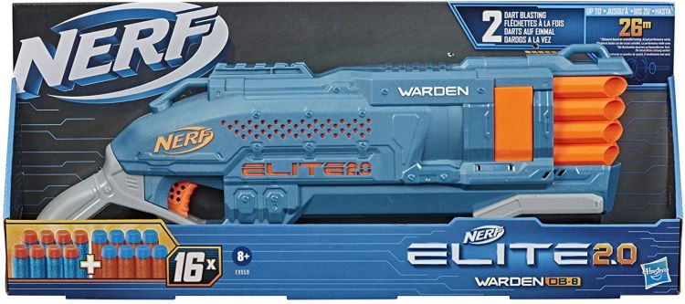 Pregateste-te pentru lupta cu blasterele Nerf Elite 2. 0 care dispun de capabilitati de personalizare incorporate, astfel incat sa le poti face upgrade si sa profite de avantajul competitiilor Nerf. Construiti-va stocul de blaster-uri Nerf Elite 2. 0 pentru a va optimiza strategia de joc si pentru a aduce performanta tactica si flexibilitate in fiecare misiune si lupta! Blasterul Nerf Elite 2. 0 Warden DB-8 trage doua sageti simultan pentru a trimite o doza dubla de putere de foc catre tintele tale. Are o capacitate de opt sageti, astfel incat sa puteti lansa o serie de sageti la competitie inainte de a reincarca. Profitati de sina tactica pentru a personaliza blasterul pentru fiecare misiune sau lupta. Trageti toate cele opt sageti rapid cu pompa-slam-fire! Include 16 sageti Nerf oficiale - 8 sageti de incarcat in blaster si 8 sageti pentru reincarcare. Lansati sageti pana la 26 de metri. Ochelari recomandati (nu sunt inclusi). Nerf si toate proprietatile aferente sunt marci comerciale ale Hasbro.