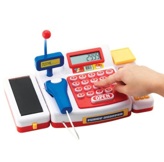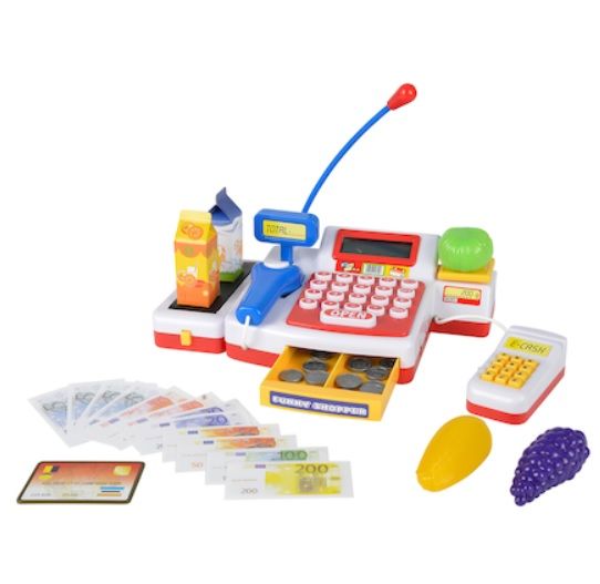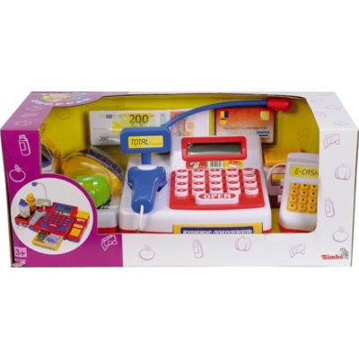 Casa de marcat cu banda si scanner Simba. Casa de marcat cu functii realiste Prevazuta cu banda cititor cod bare cititor card microfon calculator casa de bani legume 2 cutii de lapte si suc bacnote si monezi cantar. O jucarie indispensabila pt jocurile de rol de-a vanzatorul la cumparaturi. Functioneaza pe baza de baterii 3 x 1 5 V R6 neincluse in produs. Varsta recomandata de la 3 ani. Dimensiune 30 x 18 cm.Specificatii