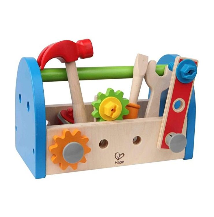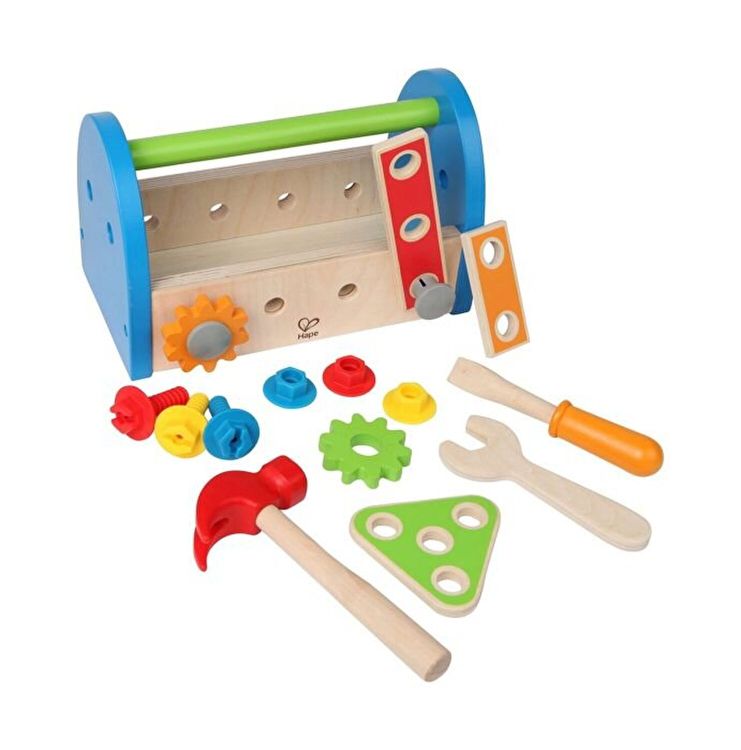 Piulitele, suruburile si toate instrumentele de care micii constructori au nevoie, sunt ambalate in acest set de unelte. Numiti instrumentele pe care le foloseste copilul dumneavoastra. Descrie ce face fiecare. Cutia de instrumente a fost creata astfel incat piesele sa poata fi atasate chiar pe ea.