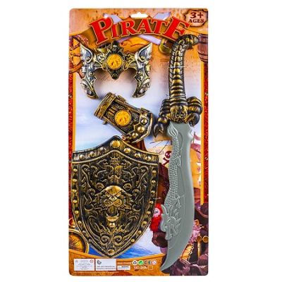 Un cavaler adevarat trebuie sa fie curajos puternic si nobil dar cel mai important trebuie sa aiba arme si armuri demne de titlul sau. Cu acest set de arme fiecare copil se va simtii ca un nobil cavaler pregatit sa infrunte piratii. Caracteristici - Setul contine 1 spada 1 protectie pentru brat 1 scut si 1 aparatoare pentru piept. - Scutul are banda din plastic pentru prindere in mana. - Protectia pentru brat si aparatoarea pentru pot fi fixate cu elastice pamblica textila nu sunt incluse avand locuri speciale pentru prinderea acestora. - Piesele au forme in relief cu dragoni. - Jucaria este realizata din plastic de calitate non-toxic. - Acest produs este potrivit pentru joaca de zi cu zi sau pentru spectacole scolare putand face parte din recuzita. - Efectul jocului asupra dezvoltarii abilitatilor motrice este deosebit de important iar copilul prin joc isi coordoneaza miscarile cu atentia vizuala. In final prin aceste jocuri copilul intra in contact cu conceptele de bine si rau dezvoltand abilitati sociale si sentimentul de incredere si empatie. - Ambalaj blister. Dimensiune piese spada 56. 5x12x3 cm protectie pentru brat 13. 5x8. 5x2. 7 cm scut 29x20. 7x2. 5 cm si aparatoare pentru piept 17. 3x14x2 cm Avertizare Produsul este nou si comercializat in ambalajul original al producatorului. Imaginile de pe acest site au caracter informativ. Ambalajul trebuie indepartat recuperat si aruncat de catre un adult inainte de a se da spre utilizare copilului. Nu lasati ambalajele produselor la indemana copiilor. Se recomanda utilizarea produsului sub supravegherea unui adult. Produsul poate contine piese mici care se pot inghiti sau inhala de cei mici existand pericolul de sufocare sau nu este potrivita copiilor mai mici de 3 ani. Pastrati instructiunile si etichetele pentru referinte viitoare. Pastrati produsul departe de foc si nu il lasati in preajma temperaturilor ridicate si a umiditatii. Datorita masurarii manuale a produsului poate exista o diferenta minora fata de dimensiunea reala a produsului.Specificatii