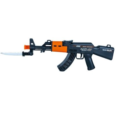 Tinteste si trage ca un adevarat soldat Micii prichindei vor fi incantati de acesta arma de jucarie. Pusca este o modalitate foarte buna de dezvoltare a creativitatii si coordonarii copiilor. Caracteristici - Pusca are sunete ce imita realitatea lumini teava cu miscare fata-spate si cutit baioneta in varful armei. - Baioneta are varful tefit pentru a prevenii accidentele. Daca se doreste in timpul jocului baioneta poate fi pliata. - Designul armei armei imita pusca de asalt AK-47. - Mitraliera utilizeaza 3 baterii AA 1. 5V nu sunt incluse . Bateriile se introduc in pozitia corecta respectandu-se polaritatea. Compartimentul bateriilor trebuie sa fie curat. Bateriile epuizate se schimba si se recicleaza conform normelor in vigoare. In cazul neutilizarii jucariei pentru mai mult timp se scot bateriile pana in momentul refolosirii. - Efectul jocului asupra dezvoltarii abilitatilor motrice este deosebit de important iar copilul prin joc isi coordoneaza miscarile cu atentia vizuala. In final prin aceste jocuri copilul intra in contact cu conceptele de bine si rau dezvoltand abilitati sociale si sentimentul de incredere si empatie. - Ambalaj folie. Dimensiune mitraliera cu baioneta 44x12. 5x2. 5 cm Avertizare Produsul este nou si comercializat in ambalajul original al producatorului. Imaginile de pe site au caracter informativ. Ambalajul trebuie indepartat recuperat si aruncat de catre un adult inainte de a se da spre utilizare copilului. Nu lasati ambalajele produselor la indemana copiilor. Se recomanda utilizarea produsului sub supravegherea unui adult. Produsul poate contine piese mici care se pot inghiti sau inhala de cei mici existand pericolul de sufocare sau nu este potrivita copiilor mai mici de 3 ani. Pastrati instructiunile si etichetele pentru referinte viitoare. Pastrati produsul departe de foc si nu il lasati in preajma temperaturilor ridicate si a umiditatii. Datorita masurarii manuale a produsului poate exista o diferenta minora fata de dimensiunea reala a produsului.Specificatii
