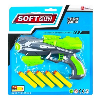 Distractie 100 pentru copii si parinti cu un pistol cu gloante de burete ce va oferi o experienta de neuitat pentru toata familia. Caracteristici Pistol spatial cu gloante inofensive din burete Trage pana la 12 metri distanta 5 gloante din burete cu cap din cauciuc Poate reprezenta cadoul ideal Dimensiuni 17. 5 x 11 cm. Varsta recomandata 6 ani Avertizare Produsul este nou si comercializat in ambalajul original al producatorului. Imaginile de pe acest site au caracter informativ. Ambalajul trebuie indepartat recuperat si aruncat de catre un adult inainte de a se da spre utilizare copilului. Nu lasati ambalajele produselor la indemana copiilor. Se recomanda utilizarea produsului sub supravegherea unui adult. Produsul poate contine piese mici care se pot inghiti sau inhala de cei mici existand pericolul de sufocare sau nu este potrivita copiilor mai mici de 3 ani. Pastrati instructiunile si etichetele pentru referinte viitoare. Pastrati produsul departe de foc si nu il lasati in preajma temperaturilor ridicate si a umiditatii. Nerecomandat copiilor cu varsta mai mica de 6 aniSpecificatii
