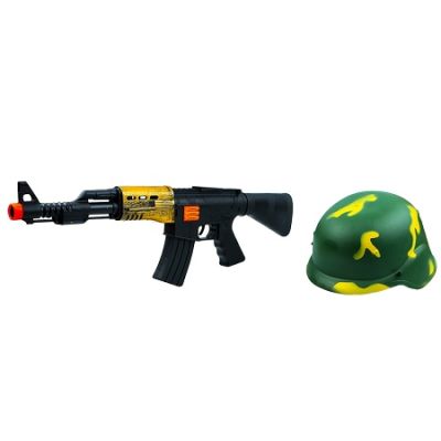 Orice baietel iubeste sa creada ca este un mic erou si ca poate salva lumea. Acest set cu siguranta il va incanta atunci cand va intra in rolul personajului - erou militar. Caracteristici - Jucaria contine casca si mitraliera cu luneta. - Inainte de utilizarea jucariei este necesara asamblarea mitralierei se atasaza luneta si teava la corpul armei. - La apasarea tragaciului se aude un sunet ce imita sunetul de tragere. - Casca are elastic de fixare sub barba. - Produsul este realizat din plastic rezistent non-toxic. - Casca are imprimeu camuflaj. - Jucaria se poate folosi atat pentru joaca in interior cat si in aer liber. - Neavand proiectile jucaria poate fi utilizata de catre copiii mai mici care isi doresc o arma de jucarie. - Efectul jocului asupra dezvoltarii abilitatilor motrice este deosebit de important iar copilul prin joc isi coordoneaza miscarile cu atentia vizuala. In final prin aceste jocuri copilul intra in contact cu conceptele de bine si rau dezvoltand abilitati sociale si sentimentul de incredere si empatie. - Ambalaj plasa. Dimensiune arma asamblata 52. 5x9x3. 8 cm Dimensiune casca 20. 5x19x12. 5 cm exterior 17. 5x16 cm interior Avertizare Produsul este nou si comercializat in ambalajul original al producatorului. Imaginile de pe site au caracter informativ. Ambalajul trebuie indepartat recuperat si aruncat de catre un adult inainte de a se da spre utilizare copilului. Nu lasati ambalajele produselor la indemana copiilor. Se recomanda utilizarea produsului sub supravegherea unui adult. Produsul poate contine piese mici care se pot inghiti sau inhala de cei mici existand pericolul de sufocare sau nu este potrivita copiilor mai mici de 3 ani. Pastrati instructiunile si etichetele pentru referinte viitoare. Pastrati produsul departe de foc si nu il lasati in preajma temperaturilor ridicate si a umiditatii. Datorita masurarii manuale a produsului poate exista o diferenta minora fata de dimensiunea reala a produsului.Specificatii
