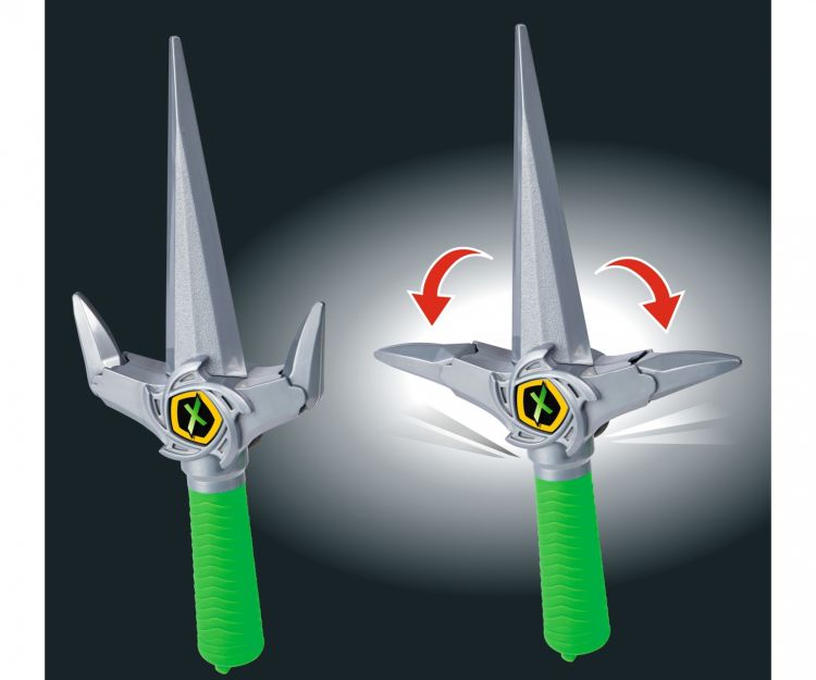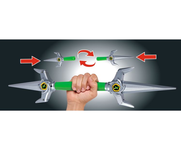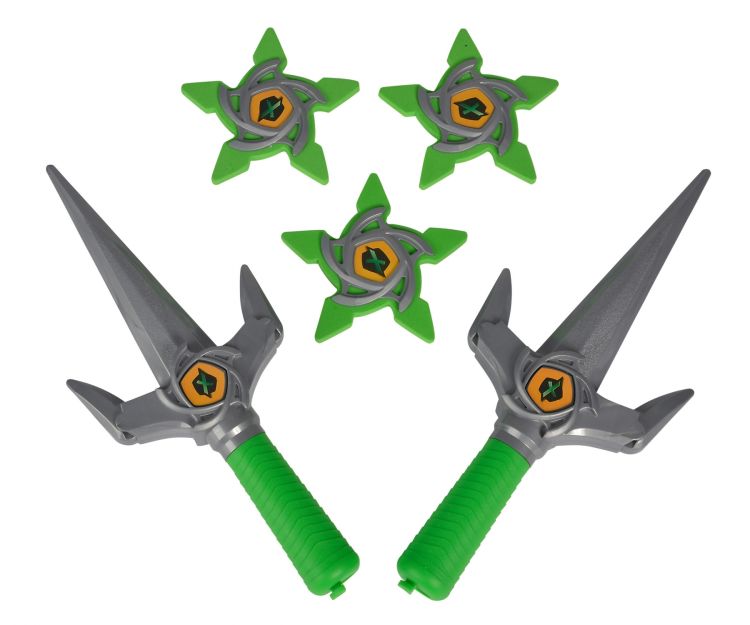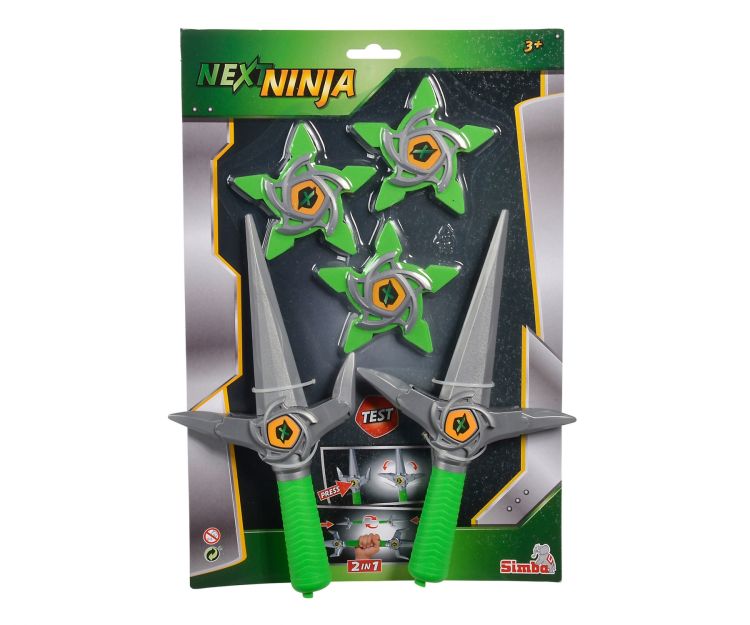 Cu cutitul Next Ninja si cu stelele aruncate, copiii se pot strecura in rolul unui ninja real. Cele doua cutite au o functie mecanica si pot fi puse impreuna. Daca apasati butonul, panourile laterale argintii se deschid deasupra manerului. Setul include si trei stele aruncatoare
