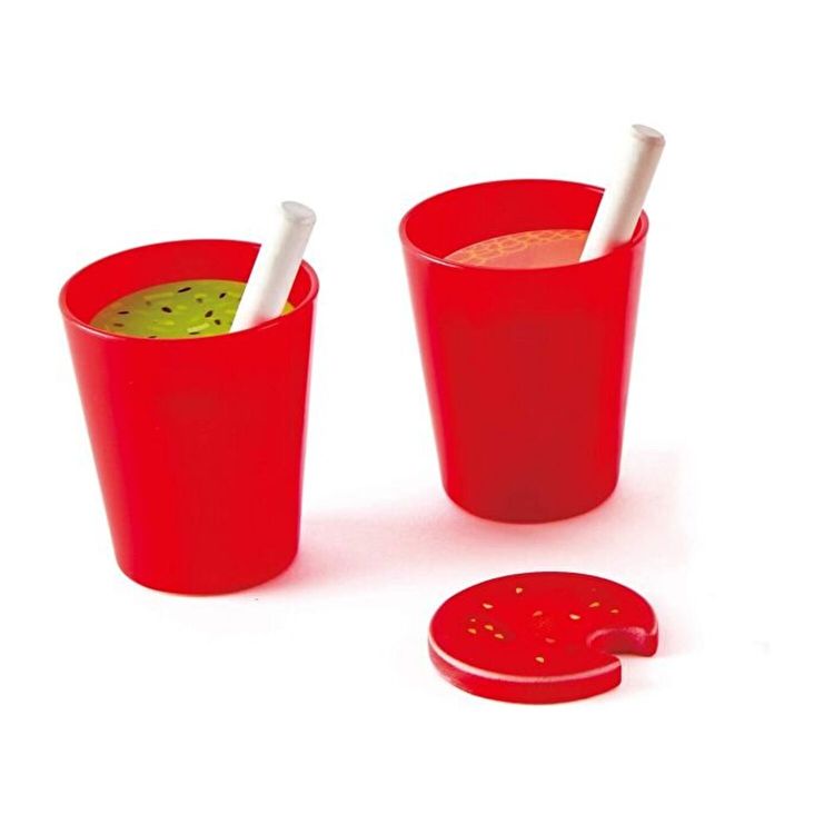 Bauturile smoothie sanatoase sunt un mod delicios de a va manca fructele si legumele! Faceti-va propriile piureuri de legume si fructe cu acest blender care vine cu doua cani si include fructe si bucati de spanac pentru bebelusi. Adunati diferitele ingrediente pe care le doriti in smoothie. Puneti ingredientele in blender si apasati butonul rosu. Fructele si legumele se vor roti la fel ca un adevarat blender. Turnati smoothie-ul in cupe si impartiti-l cu un prieten. incercati diferite combinatii. Butonul de pe blender poate fi apasat pentru a crea o actiune realista de rotire. Vine cu cinci tipuri de ingrediente, inclusiv portocale, mar, capsuni, pepene verde si spanac doua cani si doua paie.