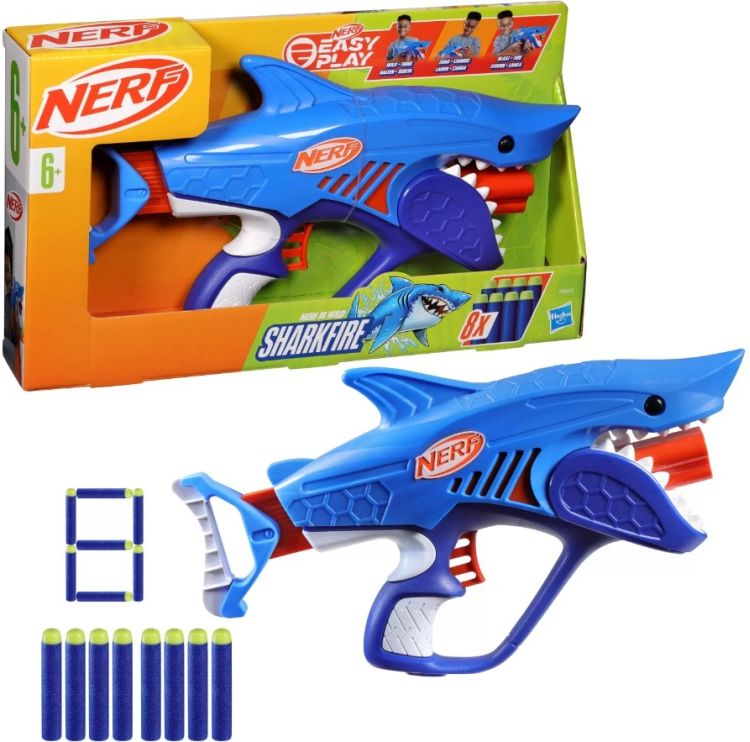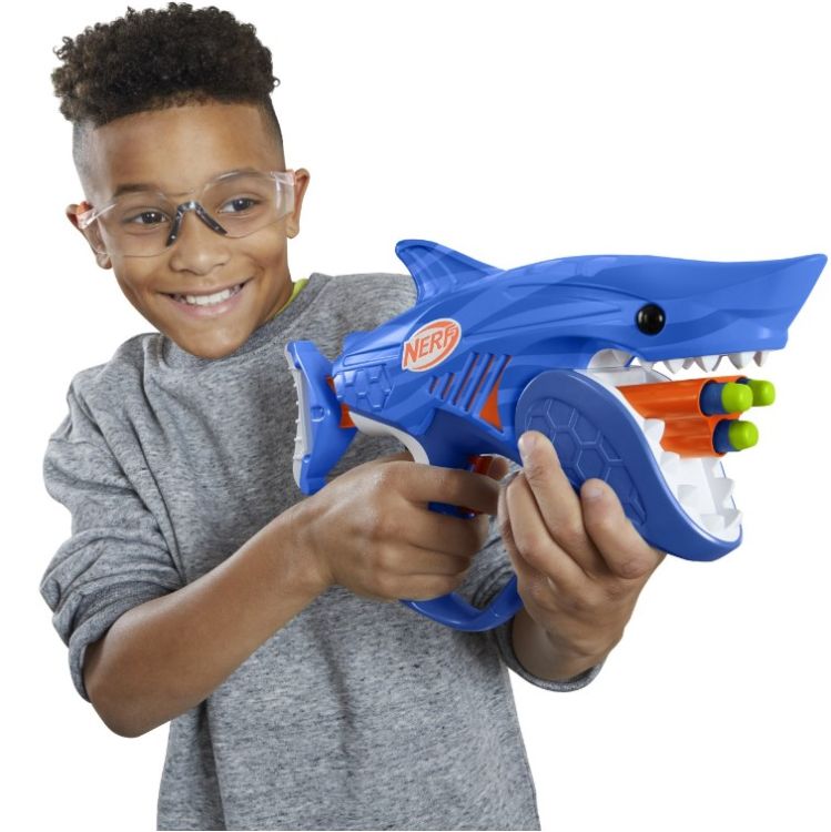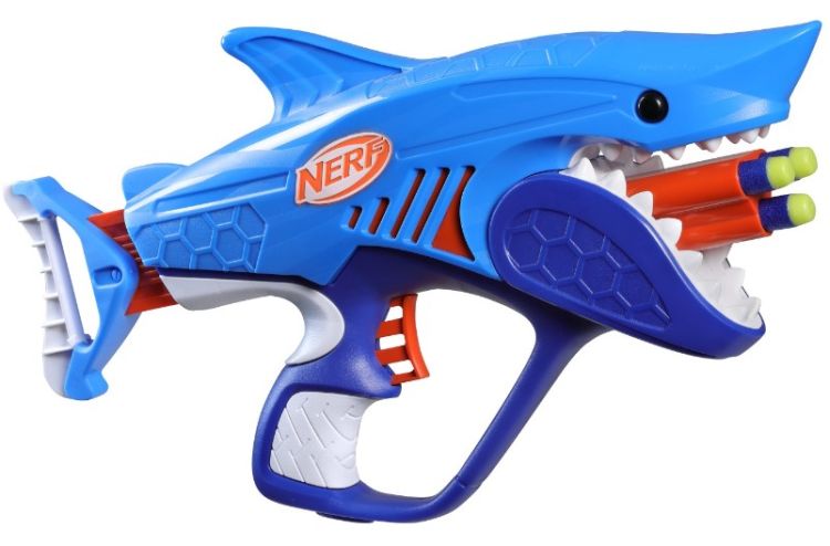 Blasterele Nerf Junior Wild sunt concepute cu caracteristici speciale usor de folosit astfel incat copiii sa se poata bucura singuri de aventuri cu lansare de sageti Nerf. Blasterele sunt usor de tinut au dimensiuni perfecte pentru mainile micute si sunt usoare astfel incat copiii sa le poata folosi in jocurile in aer liber din curte. Designul cu incarcare prin partea din fata usureaza introducerea sagetilor iar lansarea este simpla gratie manerelor cu cea mai mica forta de tragere dintre toate blasterele cu proiectile Nerf. Cu toate aceste functii copiii se pot aventura in jocuri energice si distractive cu lansare de sageti si se vor entuziasma sa se poata juca fara supraveghere. Sunt perfecte pentru baietii si fetele care se lanseaza in bataliile Nerf pentru prima data. Blasterul Nerf Junior Wild Sharkfire are un design infricosator de rechin care surprinde aspectul acestui peste fioros in culori grozave si detalii interesante Acest blaster Nerf in forma de rechin include 8 sageti Nerf Elite 2. 0 flexibile din spuma. Recomandam folosirea ochelarilor nu sunt inclusi . Fiecare blaster se comercializeaza separat. Disponibilitatea poate varia. Nerf si toate proprietatile asociate sunt marci comerciale ale Hasbro.Specificatii