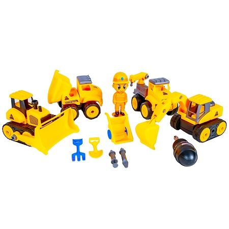 Descopera acest play set care iti va trezi simtul aventurii. Micii constructori harnici si pasionati pot sa inceapa lucrul Caracteristici - jucaria este confectionata din plastic - setul contine buldozer cu cupa camion tractare cu brat mobil cu carlig camion cu bena mobila excavator cu brat mobil figurina cu casca detasabila surubelnita cu 3 capete detasabile roaba furca lopata - cele 4 masini au rotile senilele platforma si bratele demontabile - lungime masini aproximativ 11 cm - jucaria stimuleaza motricitatea dexteritatea creativitatea si imaginatia copiilor Avertizare Produsul este nou si comercializat in ambalajul original al producatorului. Imaginile de pe site au caracter informativ. Produsul nu functioneaza cu baterii. Ambalajul trebuie indepartat recuperat si aruncat de catre un adult inainte de a se da spre utilizare copilului. Nu lasati ambalajele produselor la indemana copiilor. Se recomanda utilizarea produsului sub supravegherea unui adult. Produsul poate contine piese mici care se pot inghiti sau inhala de cei mici existand pericolul de sufocare sau nu este potrivita copiilor mai mici de 3 ani. Pastrati instructiunile si etichetele pentru referinte viitoare. Pastrati produsul departe de foc si nu il lasati in preajma temperaturilor ridicate si a umiditatii. Nerecomandat copiilor cu varsta mai mica de 3 aniSpecificatii