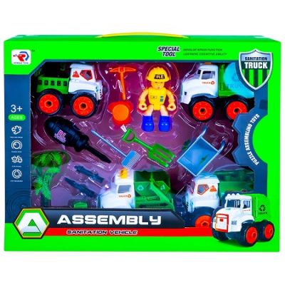 Descopera acest play set care iti va trezi simtul aventurii. Micii fermieri harnici si pasionati pot sa inceapa lucrul Caracteristici - jucaria este confectionata din plastic - setul contine camion cu remorca si brat cu carlig camion salubrizare cu clapeta din spatele benei mobila camion salubrizare cu container detasabil camion-cisterna cu tun de apa ce se roteste figurina cu bocanci si casca detasabilie casca surubelnita cu 3 capete detasabile roaba furca matura tarnacop cos gunoi palmier - cele 4 masini au partile componente demontabile - lungime masini aproximativ 11 cm - jucaria stimuleaza motricitatea dexteritatea creativitatea si imaginatia copiilor Avertizare Produsul este nou si comercializat in ambalajul original al producatorului. Imaginile de pe site au caracter informativ. Produsul nu functioneaza cu baterii. Ambalajul trebuie indepartat recuperat si aruncat de catre un adult inainte de a se da spre utilizare copilului. Nu lasati ambalajele produselor la indemana copiilor. Se recomanda utilizarea produsului sub supravegherea unui adult. Produsul poate contine piese mici care se pot inghiti sau inhala de cei mici existand pericolul de sufocare sau nu este potrivita copiilor mai mici de 3 ani. Pastrati instructiunile si etichetele pentru referinte viitoare. Pastrati produsul departe de foc si nu il lasati in preajma temperaturilor ridicate si a umiditatii. Nerecomandat copiilor cu varsta mai mica de 3 aniSpecificatii