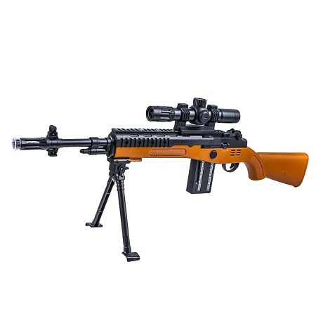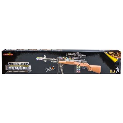 Baietii adora jucariile sub forma unor pusti pistoale sau imitatii a altor arme. Cu cat sunt mai realiste mai zgomotoase si mai mari cu atat bucuria celor mici este mai mare. Caracteristici - Pusca are sunete ce imita realitatea lumini iar teava se misca fata-spate. Pentru aceasta are nevoie de 3 baterii AA 1. 5V nu sunt incluse . Bateriile se introduc in pozitia corecta respectandu-se polaritatea. Compartimentul bateriilor trebuie sa fie curat. Bateriile epuizate se schimba si se recicleaza conform normelor in vigoare. In cazul neutilizarii jucariei pentru mai mult timp se scot bateriile pana in momentul refolosirii. - Arma necesita asamblare. Aceasta este usoara cele 2 piese luneta si suportul pustii trebuind doar introduse pe sinele corespunzatoare. - Copiii se pot juca alaturi de prieteni avand un timp activ distractiv si plin de imaginatie. Efectul jocului asupra dezvoltarii abilitatilor motrice este deosebit de important iar copilul prin joc isi coordoneaza miscarile cu atentia vizuala. In final prin aceste jocuri copilul intra in contact cu conceptele de bine si rau dezvoltand abilitati sociale si sentimentul de incredere si empatie. - Jucaria este ambalata in cutie din carton. Avertizare Produsul este nou si comercializat in ambalajul original al producatorului. Imaginile de pe acest site au caracter informativ. Ambalajul trebuie indepartat recuperat si aruncat de catre un adult inainte de a se da spre utilizare copilului. Nu lasati ambalajele produselor la indemana copiilor. Se recomanda utilizarea produsului sub supravegherea unui adult. Produsul poate contine piese mici care se pot inghiti sau inhala de cei mici existand pericolul de sufocare sau nu este potrivita copiilor mai mici de 3 ani. Pastrati instructiunile si etichetele pentru referinte viitoare. Pastrati produsul departe de foc si nu il lasati in preajma temperaturilor ridicate si a umiditatii. Datorita masurarii manuale a produsului poate exista o diferenta minora fata de dimensiunea reala a produsului.Specificatii