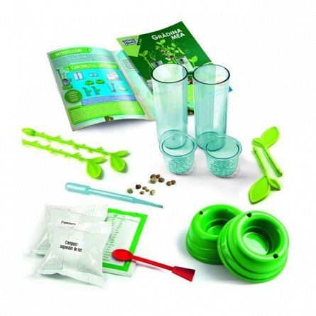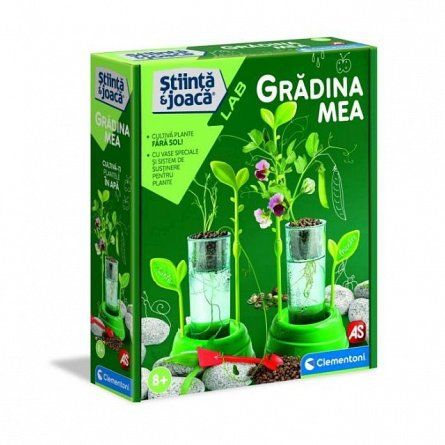 Seturile Stiinta amp Joaca imbina distractia cu educatia Cu setul Gradina mea de la AS copilul va putea experimenta cu tehnica inovatoare hidroponica si cultiva plantele in apa observand si monitorizand zilnic cresterea plantelor si dezvoltarea radacinilor. Setul contine vase transparente recipiente cu orificii de scurgere farfurioare pentru vasele transparente punga cu compost de lut betisoare de sustinere pipeta spatula punga cu seminte si un manual de instructiuni bogat ilustrat pentru a ajuta copiii in realizarea celor mai fascinante experimente si a cultiva plantele fara sol Setul este recomandat copiilor de la 8 ani.Specificatii