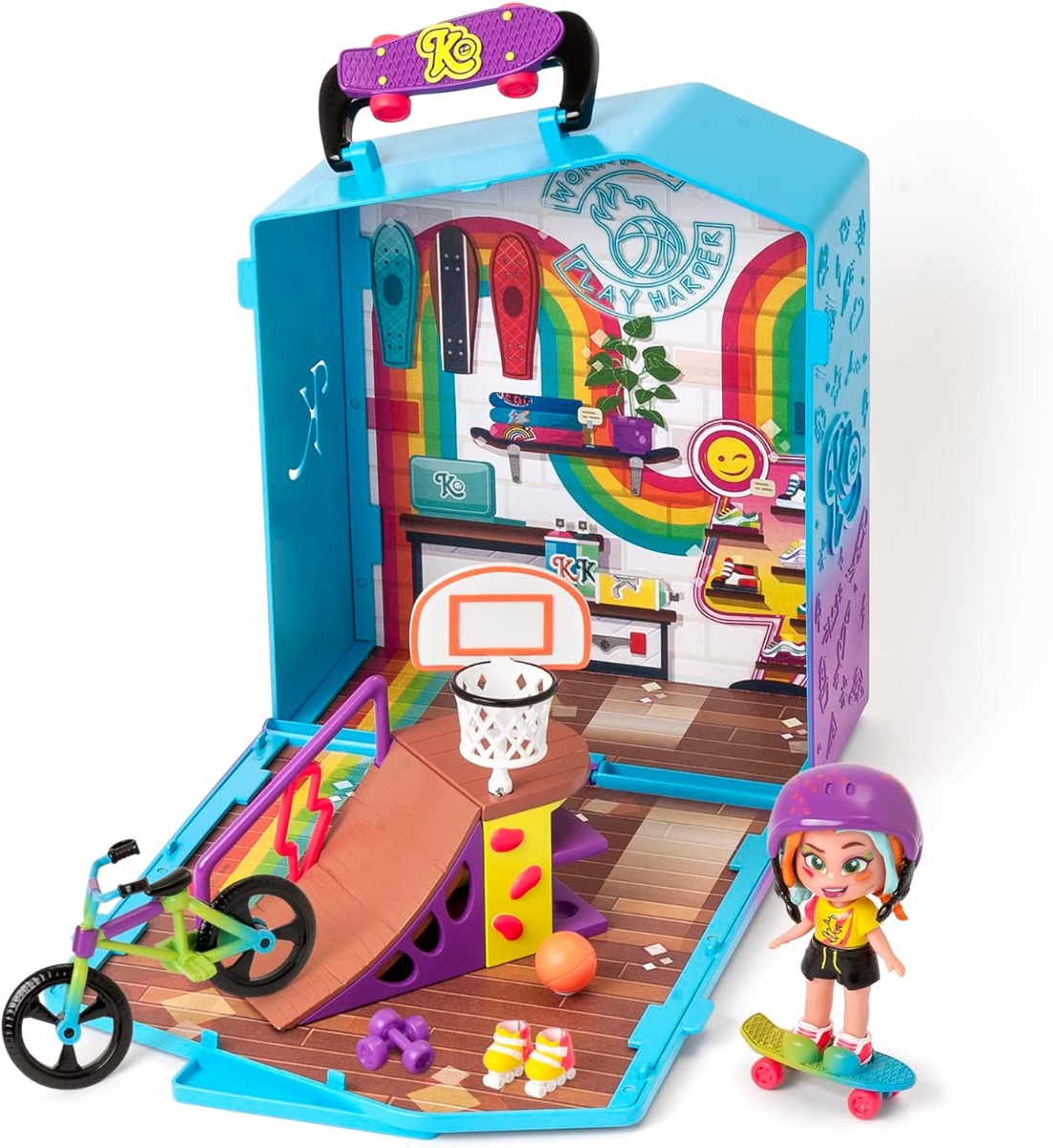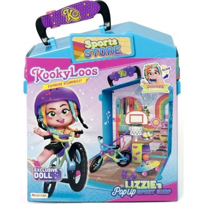 Lizzie este cea mai sportiva dintre toate papusile KookyLoos si vrea sa-i ajute pe altii cu cunostintele si abilitatile ei. Daca iti place si tie sportul trebuie sa mergi neaparat in vizita la magazinul ei cu articole sportive Lizzie te va invata cum sa mergi cu bicicleta si cum sa-ti impresionezi prietenii cu cascadorii cu skateboard-ul pentru asta poti folosi si rampa inclusa. Invita alti prieteni KookyLoos la joaca si organizeaza un meci de baschet. Te vei distra de minune cu Lizzie la magazinul ei cu articole sportive Aminteste-ti ca poti schimba cele trei expresii faciale ale papusii KookyLoos cu o simpla rotire.Specificatii