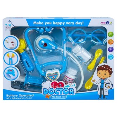 Cei mici adora sa se joace de-a doctorul iar acum pot sa utilizeze trusa perfecta pentru aceasta. Setul contine stetoscop seringa flacon medicamente si alte accesorii. Acest joc permite copiilor familiarizarea cu domeniul medical acest lucru ducand la ameliorarea anxietatii copiilor vis-a-vis de vizitele la medic. Caracteristici - Jucaria este confectionata din material plastic de calitate non-toxic. - Setul contine stetoscop seringa ciocanel 2 flacoane pentru medicamente ochelari 2 lingurite. - Stetoscopul are lumina intermitenta si sunet ce imita bataile inimii iar ciocanelul are led luminos. Pentru a activa functiile de lumina si sunet este necesar ca banda din plastic ce separa bateriile sa fie scoasa. - Pistonul seringii revine in pozitia initiala dupa ce este apasat datorita arccului din interiorul seringii. - Produsul incurajeaza jocurile de rol dezvoltand imaginatia creativitatea dexteritatea comunicarea si empatia. - Jucaria functioneaza cu baterii incluse. - Setul este ambalat in cutie din carton cu decupaj. Dimensiuni instrumentar medical stetoscop 55. 5x12. 5x3 cm ciocanel 11x5. 8x3. 5 seringa 12x5. 5x3. 5 cm ochelari 12. 7x5x11. 3cm Avertizare Produsul este nou si comercializat in ambalajul original al producatorului. Imaginile de pe site au caracter informativ. Ambalajul trebuie indepartat recuperat si aruncat de catre un adult inainte de a se da spre utilizare copilului. Nu lasati ambalajele produselor la indemana copiilor. Se recomanda utilizarea produsului sub supravegherea unui adult. Produsul poate contine piese mici care se pot inghiti sau inhala de cei mici existand pericolul de sufocare sau nu este potrivita copiilor mai mici de 3 ani. Pastrati instructiunile si etichetele pentru referinte viitoare. Pastrati produsul departe de foc si nu il lasati in preajma temperaturilor ridicate si a umiditatii. Datorita masurarii manuale a produsului poate exista o diferenta minora fata de dimensiunea reala a produsului. Datorita masurarii manuale a produsului poate exista o diferenta minora fata de dimensiunea reala a produsului.Specificatii