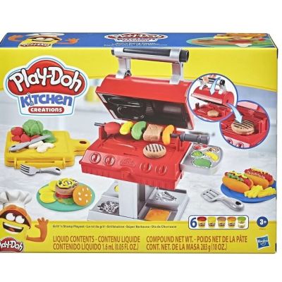 Acest set cu gratar Play-Doh aduce distractia gatitului in familie direct in spatiul de joaca In primul rand creeaza burgeri hotdogi si aripioare de pui de jucarie Play-Doh cu formele de pe gratar si tocator. Pune-le pe gratarul de jucarie inchide capacul si tusiera incorporata va stampila urme de friptura pe creatiile tale Nu te ingrijora poti reutiliza pasta Play-Doh chiar si dupa ce o stampilezi cu cerneala. Copiii pot crea si kebab de jucarie folosind accesoriile specifice si o multime de alte toppinguri Play-Doh cu aceasta jucarie gratar pentru copii. Folosind pasta de modelat Play-Doh in 6 culori din cutiile de 56 si 28 de grame micutii bucatari sefi au toate lucrurile de care au nevoie pentru a se juca de-a gatitul. Acest set de joaca este pentru copiii cu varsta de la 3 in sus si reprezinta un cadou extraordinar cu ocazia zilei de nastere sau o surpriza fantastica pentru copiii care adora lutul de modelat si jucariile de gatit
