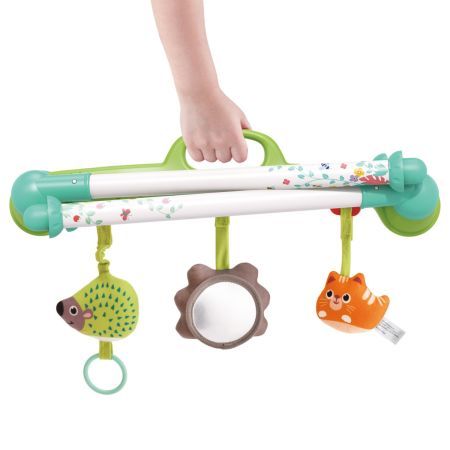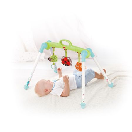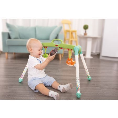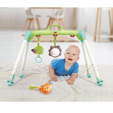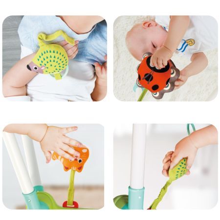 Este fabricat din material ABS si plastic durabil si de inalta calitate. Este complet sigur pentru copii. Aceasta jucarie este pentru intarirea muschilor bebelusilor si este o jucarie pentru baieti si fete. Are o baza asemanatoare cu baza unui leagan. Pliabil pentru transport usor. Poate fi folosit in 3 pozitii culcat pe spate asezat si culcat pe burta. Prezinta 3 jucarii de plus un arici o buburuza o pisica.Specificatii