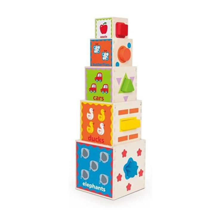 Cinci blocuri, fiecare cu cinci fete cu litere, numere, imagini, forme si culori, se adauga la zeci de moduri de a juca. Sortarea cu forme codificate prin culori faciliteaza practicarea culorilor si a formelor potrivite. Construieste turnul sau intoarce blocurile si sorteaza-le dupa marime. Practicati concepte comparative, cum ar fi mai mare / mai mic si mai inalt / mai scurt.