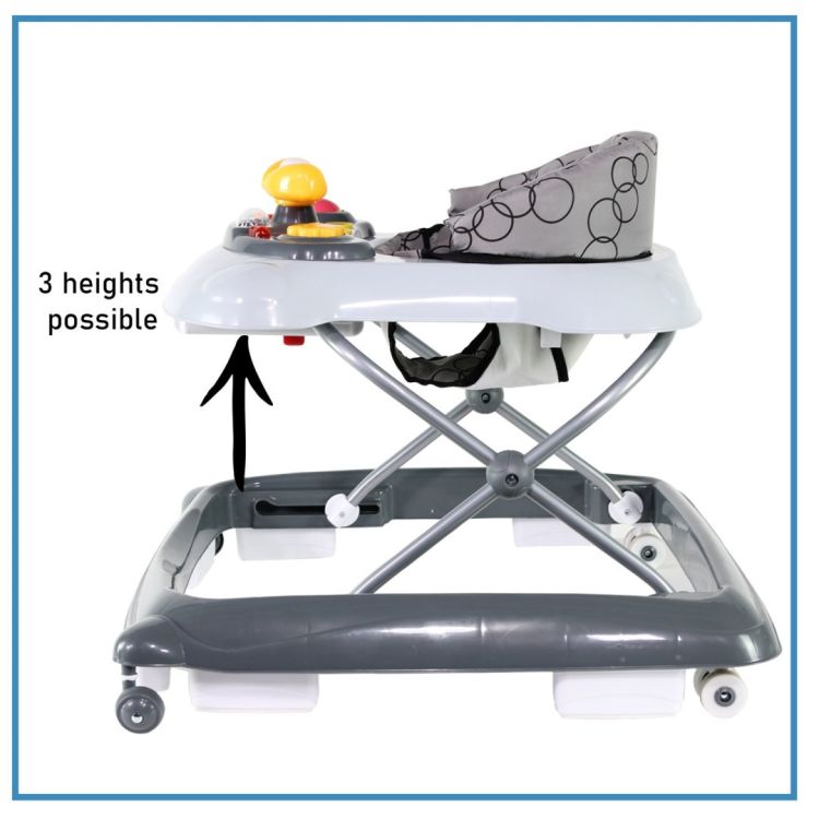 Libertate si Siguranta pentru micii exploratori. Premergatorul Migo BASILE GREY este ideal inca de la momentul in care micutul tau manifesta dorinta de a sta in picioare si de a porni in aventuri in jurul casei Asezat confortabil pe o perna ultra-confortabila bebelusul tau face primii pasi si exploreaza lumea din jur. Aceast premergator poate fi utilizat incepand cu varsta de 8 luni si pana la 76 cm datorita reglajului sau pe 3 inaltimi. Tava sa de activitati detasabila ofera multiple activitati pentru copil pentru a se juca si a se odihni dupa toate aventurile lor Formele rotunjite ale premergatorului Migo BASILE GREY si culorile vesele il fac un dispozitiv excelent pentru invatarea mersului si descoperirea mediului inconjurator. Totusi utilizarea premergatorului Migo BASILE GREY necesita cateva precautii din partea dumneavoastra evitati scarile acordati atentie la ferestre si usi si protejati produsele potential periculoase care au devenit la indemana micutului tau. Astfel bebelusul va descoperi lumea din jur in siguranta. Viata de zi cu zi este agitata. Premergatorul Migo BASILE GREY se pliaza rapid si compact facilitand depozitarea si deplasarile. Ideal pentru familiile active premergatorul poate fi transportat cu usurinta ocupand foarte putin spatiu. Astfel copilul dumneavoastra va putea explora in siguranta si in afara casei. Aventurile bebelusului presupun uneori multa murdarire. Perna de sezut a premergatorului Migo BASILE GREY este detasabila si lavabila asigurand curatarea usoara dupa aventurile bebelusului. Ofera-i bebelusului tau libertatea de a descoperi lumea din jur cu premergatorul Migo BASILE GREY. Un companion de incredere pentru fiecare etapa de crestere. Alege Migo BASILE GREY pentru a insoti primii pasi ai micului tau explorator Caracteristici Tava de activitati Se pliaza rapid si compact pentru stocare si calatorii usoare Perna de sezut detasabila si lavabila 3 inaltimi reglabile Disponibila in 3 culori Varsta De la 8 luni pana la 76 cm Dimensiuni produs Lungime 61 cm Latime 61 cm Inaltime 54 cm Greutate 4 1 kg. Materiale plastic poliester aluminiu silicon. NOTA produsul nu este livrat cu baterii. Sunt necesare 2 baterii AA LR6Specificatii