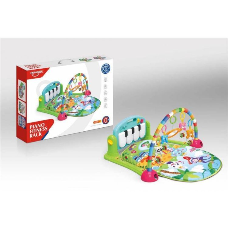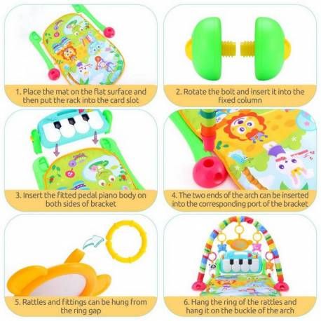 Daca doriti sa va incantati bebelusul si sa-l puneti intr-un loc sigur, atunci puteti alege covorasul nostru de fitness pentru copii. Setul include, de asemenea, un pian electronic, actionat de baterii. Este montat pe un cadru din plastic si poate fi reglat cu usurinta. Pianul are, de asemenea, snururi pe spate, care pot fi folosite pentru a lega elementul de la lamele patului. Structura materialelor folosite pentru a realiza suportul educational nu absoarbe apa, ceea ce face ca intreaga piesa sa fie usor de curatat. Dimensiunea saltelei dupa montare este de 70x53x44 cm. Sunetul pianinei se poate ajusta. În plus, cu designul sau multifunctional, ar putea fi un articol educational perfect pentru nou-nascut, pentru a instrui dezvoltarea creierului bebelusului si pentru a ajuta la dezvoltarea fitnessului pentru bebelus.